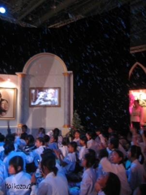 入場から退場まで約1時間ですね。見学途中に生徒が大喜びしていたのは・・・雪。本当は泡なんですが、みんな喜んでいました。王様の活動になにか関係があるのかと思ったら、ただの演出でした。乾季には寒くなる北部でも雪は降りません。私の生徒はよく言います。「日本土産に雪がほしい~」・・・ははは。ム・リ!!