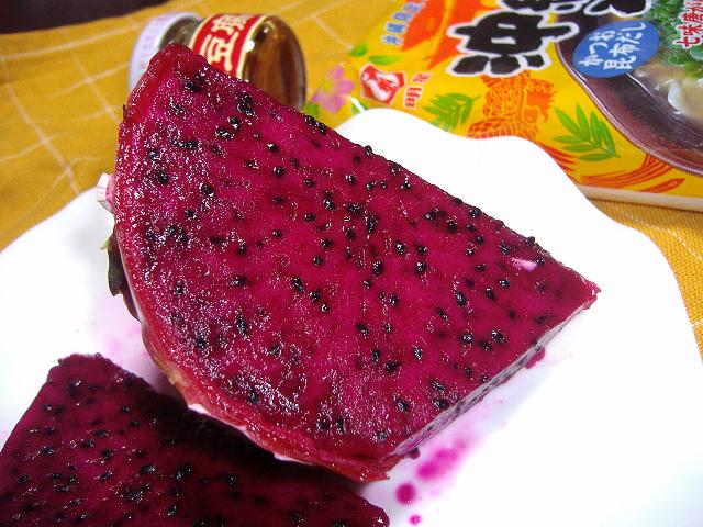 沖縄に行った友人からお土産をいただきました。ドラゴンフルーツは白い果肉に黒い種の粒々がはいってるものをよく見かけますが、赤い鮮やかな果肉のタイプをもらい早速食べてみると甘いフルーツに比べると少し物足りない味ですが、食後にはちょうどいいデザートでした。今回は赤い色だったので弱り気味の体にパワーをもらった気がします。カットした時に少し触った手にはまだ色が残っていてびっくり。。「これで何か染めてもいいかなあ。。」なんて後で思いましたが、もうすべて胃の中。。まあこれだけの色ですのでポリフェノールがたっぷり身体に取り込まれて少し明日は元気になってるかも。。一応調べてみると白いタイプはさっぱりとした酸味があり、赤いタイプはほんのり甘いとか。。南のほうの人もパワフルで長寿の人が多いけど、植物なども抗酸化力のあるものばかりみたいです。生命力を感じました。それから以前、果肉の中の種からは告がせるというのを何かで見たことがあるのでほんの少しでが黒い種を残しました。サボテンの仲間ですし、「ここでも育つかな・・」と一瞬考えたのですが、まあ後で駄目もとで調べてみますけど無理でしょうね。。また、かわいい瓶に入った【豆腐よう】というものも一緒にもらったのですが、こちらは以前私が沖縄に行った時、知ってはいたけど苦手で食べませんでした。瓶詰めですし、一口サイズなので誰かに話の種にでもして回しましょう。この「豆腐よう」とは、豆腐を紅麹と泡盛などで発酵・熟成させた発酵食品でウニのような風味とチーズのような舌触り、濃厚かつ繊細。そして上品な味はまさに珍味中の珍味だとか。。アルコールが好きな人にはたまらない珍味なんでしょうね。。私もまた沖縄に行きたくなりました。。