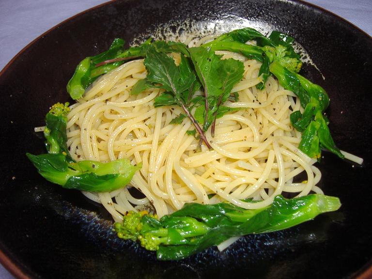 今日のお昼は菜花でスパゲティーを作りました。菜花といっても我が家のミニミニガーデンのプランターなどで育ってるチンゲンサイなどの花芽が、あっという間に伸びてきたので摘んできたものです。プランターにはチンゲンサイや小松菜、ルッコラなどちょっと青み野菜が欲しい時の為にいつも種を時間差で蒔いて育て、ベビーリーフとして間引きしたのを使ったり、少し大きくなるまで待って鍋などに使ったりしていますが、少しほっておいたらあまり丈は伸びずに花芽がでてきていました。手抜きということで、スパゲティーを茹でる時に、最後にちょっと茹でただけですが、摘みたてですので柔らかくて美味しかったです。オリーブオイルでさっと炒め、塩コショウのみのシンプルな味付けでしたが春の香りが少ししたような気がしました。上にのせてるのはルッコラです。これもいつもプランターにありますが、かわいい花が咲いたものもありました。この種はネットのお友達のぺくさんからはるばる送っていただいたものですが、一株を最後まで残して種をとればかなりとれるし、ご近所やお友達にも分けても使い切れないくらいの量が取れます。それにシソのようにこぼれ種からも勝手に育ってくれるし、冬の寒さでも平気だし、もう何代目の種かしら。。ピリリとした辛味がゴマ風味でサラダにするとドレッシングは要らないくらいです。もともとあまりドレッシングは使わないけど、ルッコラのときは実際ドレッシング無しです。今日はシンプルな味付けだったけどルッコラが味をしめてくれて私的には満足の一皿でした。そろそろバジルの種もまた蒔かなくちゃ。。