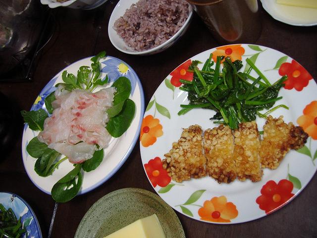 昨夜はつわぶきと共にいただいた新鮮な黒鯛の刺身をたっぷりいただきました。黒米など雑穀がたっぷりのご飯などとともにわいわい言いながら皆であっというまに食べちゃいました。勿論、主様は別の皿にちゃんとわけて準備してあります。。今夜は、一緒にいただいたキビナゴを刺身と南蛮漬けにする予定です。さて、キビナゴの刺身は手がかかるので支度始めなくちゃ。。