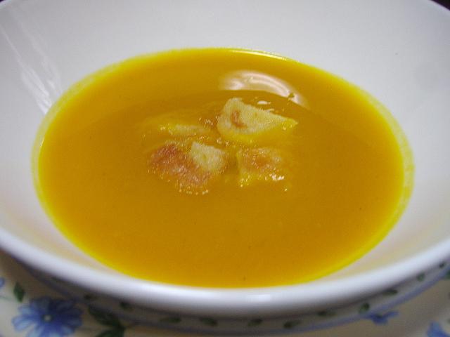 簡単手抜き【かぼちゃの冷スープ】作りました。玉ねぎをバターでいためてカボチャ、コンソメのキューブなど加えて煮たものをいつものように手抜き業《ブレンダー》を鍋の中に入れてブ~とつぶして味を調えただけ。。鮮やかなオレンジ色のスープで元気が出そうです。冷凍庫にサンドウィッチを作ったときの残り物のパンの耳でクルトン作りちょっとおしゃれして。。昔から子供達はこのクルトンが大好きで、飾りどころか大量に投入してスープがメインのはずなのにクルトンがメインのような感じのスープでした。先程作り、今冷蔵庫で冷やしてます。これならお代わりしてくれるでしょう。。さて今日は立秋とか。ここのところ、時々不安定な気候もあるときがあり一時の連続記録を更新した猛暑のときより心なしか朝晩は少ししのぎやすくなってきたような気がします。でもまだまだ日中は気温も上がり、気力は萎えたまま。。犬のプリンも夏ばて寸前で、すこしご機嫌が悪いようです。暑いし、毛皮まとってるからイライラするんでしょうね。今、やっと日も翳ってきて涼しくなってきたので庭先で涼み始めています。。あとしばらく我慢して、夏を乗り切ってもらわないといけないので後で大好きなさつま芋の蒸かしたおやつをあげましょう。。さつま芋もだいぶ大きなサイズのものが出回り始めました。だんだん甘さも増すでしょうし、楽しみな季節がやってきます。こう思うと、この暑さも乗り切れそうですから。。