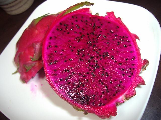 サボテン繋がりのつもりじゃなかったけど娘が珍しい果物《ドラゴンフルーツ》をいただいてきたので早速切り分けていただきました。果肉の部分が白いものと赤いものがありますが、今回は赤い品種で、それはそれは見事ないろでした。鮮やか過ぎて、その色素が指先にまだ残ったまま。。先日、テレビでこの果物を食べてるところが紹介されていて皮も酢の物だったかしら、無駄なく利用するというのがありましたので今回は捨てずに皮もあとでいただくことにします。これだけのポリフェノールをとりこんだので少しは衰えた体の酸化にブレーキがかかったかしら?私の体はこれくらいじゃ無理かな。。。(ーー;)夜になり、少し激しい雨が降りましたが今は止んでいます。でも明日も大雨の予報も出てるし、一応その心つもりでいましょう。どこも被害が出ないといいんだけど。。