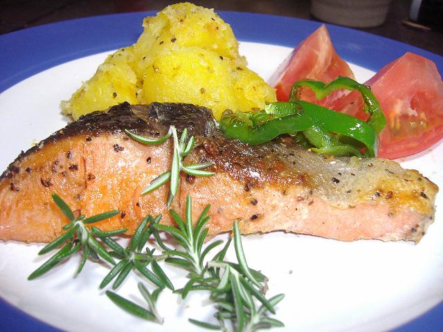 昨夜、美味しい紅鮭をたくさん買ったので早速バター焼きでいただきました。通販ですがスライスする厚さも選べたので少し厚めに切ってもらい、当分は鮭三昧の日々が続きそうです。娘は焼いておにぎりに入れるとか、お茶漬けにするとか楽しみしています。少し塩がきいてるので、おにぎりにもちょうどいいかも。。付け合せにとじゃがいもをローズマリー風味にしましたが、ちょっと多めに摘んできて余ってたので鮭の仕上げにも添えて一緒にいただきました。私はローズマリーもお気に入りのハーブでこれだけの量も残さずにいただいたんですが、家族には少し多かったようです。香りも味も少し強いから仕方ないですね。。今夜は、主様には鍋として登場します。ところで最近、少し体重と体脂肪が減っています。時々ダウンすると食欲どころじゃないから2~3キロ減るし、そのあと復活するとまた食いしん坊にもどり元に戻るという繰り返しでお腹周りはたるんでしまっています。。(ーー;)ただいつも体重は減っても体脂肪まではなかなか落ちなかったので今回は少し驚いています。少し夏ばての後遺症で食べ物の摂取カロリーも少なくなってはいますが、久々の数値に少し嬉しいかも。。先程ご近所のお友達にも腰ではくジーパンのウエストのユルユルを発見され「痩せた?」と聞かれました。娘からも「今で少し運動して腹筋の運動をすればたるみも減るから。。」といわれてるけど最近は運動らしきものはプリンとのお散歩だけ。娘の友人が一日で脱走したあのビリーのキャンプをいただいたのでこの前娘と試してみましたが、何とか遅れながらもついていけたのは最初10分くらいだけ。。後は娘が汗を流して必死でやってるのを横からあれこれと口出ししてただけでした。最初の一枚目のDVDでかなりのハードな運動だったので腹筋が割れるのを少し夢見ていた次女も、それ以後封印の様子。たぶん、忘れた頃にまた入隊かな?勿論、私はCMで紹介されてるくらいの時間で充分ですので入隊なんて考えもしませんが。。(ーー;)