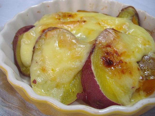 今日もさつま芋のレシピつくりということで簡単に出来るグラタンにしてみました。蒸かしたさつま芋を厚めに輪切りにしてバターを塗ったグラタン容器に並べて、マヨネーズを少し回してかけ上からとけるチーズをのせてトースターで焼いただけのシンプルすぎる一品です。さつま芋は乳製品と相性がいいようでホクホクして喉につかえそうなさつま芋もマヨネーズやチーズが口当たりをよくしてくれて簡単なわりにはちょっと手がかかってるように誤魔化せる一品かも。。(^^ゞ今日も朝から大量のさつま芋を蒸かして体からさつま芋の芽が出そうな感じです。。先日近くの無人販売所で沢山かったさつま芋が中が病気のような感じで痛んでるものが多くて迷った末に連絡したら返品ということでさつま芋が台所にどっさりあります。大きくて綺麗なものが痛んでるみたいだし、また家で切って残念な思いをするよりはと、全部半分に目の前で切ってもらったので早くそれから使い切ってしまわないと又それも痛むし、半分に切ってさつま芋のにおいがするのでプリンが夜食に持ってきてポリポリと食べてしまうのです。「早いもの勝ち!」じゃないけどプリンには小さいもので我慢して欲しいし大きなものは私が先に使いたいので競争です。今日はまだまだ何品か作っていますので順に紹介できると思います。さつま芋が嫌いな方にはお気の毒ですが、当分はさつま芋メニューですのでご勘弁くださいませ!