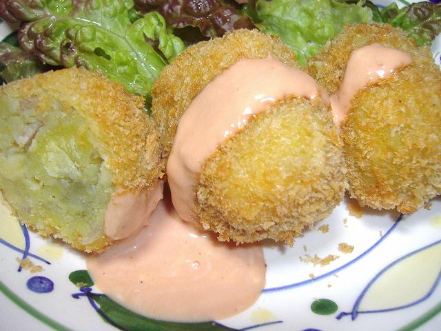 さつま芋で作ったコロッケです。今回のさつま芋がすごくホクホクしててマッシャーでつぶすのに一苦労しました。中には玉ねぎ、りんご、豚肉を細かく切ったものを炒めてから混ぜ合わせて後は小麦粉、とき卵、パン粉の順に衣をつけてあげたものです。今回のさつま芋はあまり甘いほうではなかったけど玉ねぎやりんごなどが加わったので相乗効果で甘さがバージョンアップしおやつにしてもいいくらになりました。次回はもう少したまげ儀や豚肉も増やしてみましょう。さて、今日は今からは方まで日帰りしてきます。娘からコンサートのチケットをプレゼントされたので久々に楽しんではちきれてきます。。その長女も入れ替わりに週末をこちらで過ごす為に一家で里帰りするので夜は一足早い我が家の忘年会になります。それまでには何とか帰り着いてるでしょうから、駅からお店に直行して婿殿や孫が加わった総勢7名のI家の食事会に参加する予定になっています。少し若作りの格好をしていくつもりですが、おしゃれをするのは少し我慢だと思い出しました。短めのスカートは少しウエストもきつめだし、トップスもおしゃれだけど少し薄いので寒いかも。。つい楽な格好で妥協しようとする私を娘達の厳しい審査があり、「おしゃれは少し我慢!」といわれてしまいました。とりあえず55歳にはみえないといわれたのでその気になって楽しんできます。豚はおだてられるとすぐに木に登るんですよね。。(^0_0^)