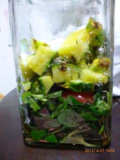 昨日と今日、続けてまた酵素ジュースを仕込みました。どくだみの酵素ジュースは実験的にしてみるので仕込む量を控えめにしました。どくだみは摘んできたときからにおうし、カットしたらさらにパワーアップする香り。ちょうどニンジンを無人販売所で買ってきてきれいな葉がついていたのでこれも加えて、さらにセロリの葉、パセリなども少しずつですが加えていくとどくだみのにおいもだいぶ中和されてきて、ミックスハーブの香りになってきました。ただ味が少し心配だったので、いつものように川がついたカットパインを買い、そのパインの皮を刻んで加えてフルーツ味に少しでもなるようにしてみました。もちろん、パインの果肉は陶土16度で甘くて美味しくて一人で食べてしまいました。こちらは昨日の金柑酵素ジュースです。金柑は何度かすでに酵素ジュースにするときの材料に使いましたが今回は季節的にももうこれが最後の金柑でしょうし、金柑単品での酵素ジュースということで。。きれいなオレンジ色のジュースになるでしょう。今はヨモギやほうれん草など緑系のもので仕込んだジュースを少しづつ飲んでいますが、少しだけアルコール発酵してる感じです。アルコールがだめな私の体が感知してるからたぶん間違いないでしょう。アルコール類が入ったケーキほどではないからほんのわずかでしょうが、飲んだ後に私の手がポッと反応して赤くなります。今はダイエットということで話題のようですが、私がダイエットできるくらい飲むのは無理でしょうね。腸の中でいい働きをして、環境が少しでもよくなればいいくらいの期待です。さて生の酵素ジュースつくり、マイブームはいつまで続くでしょうか。。