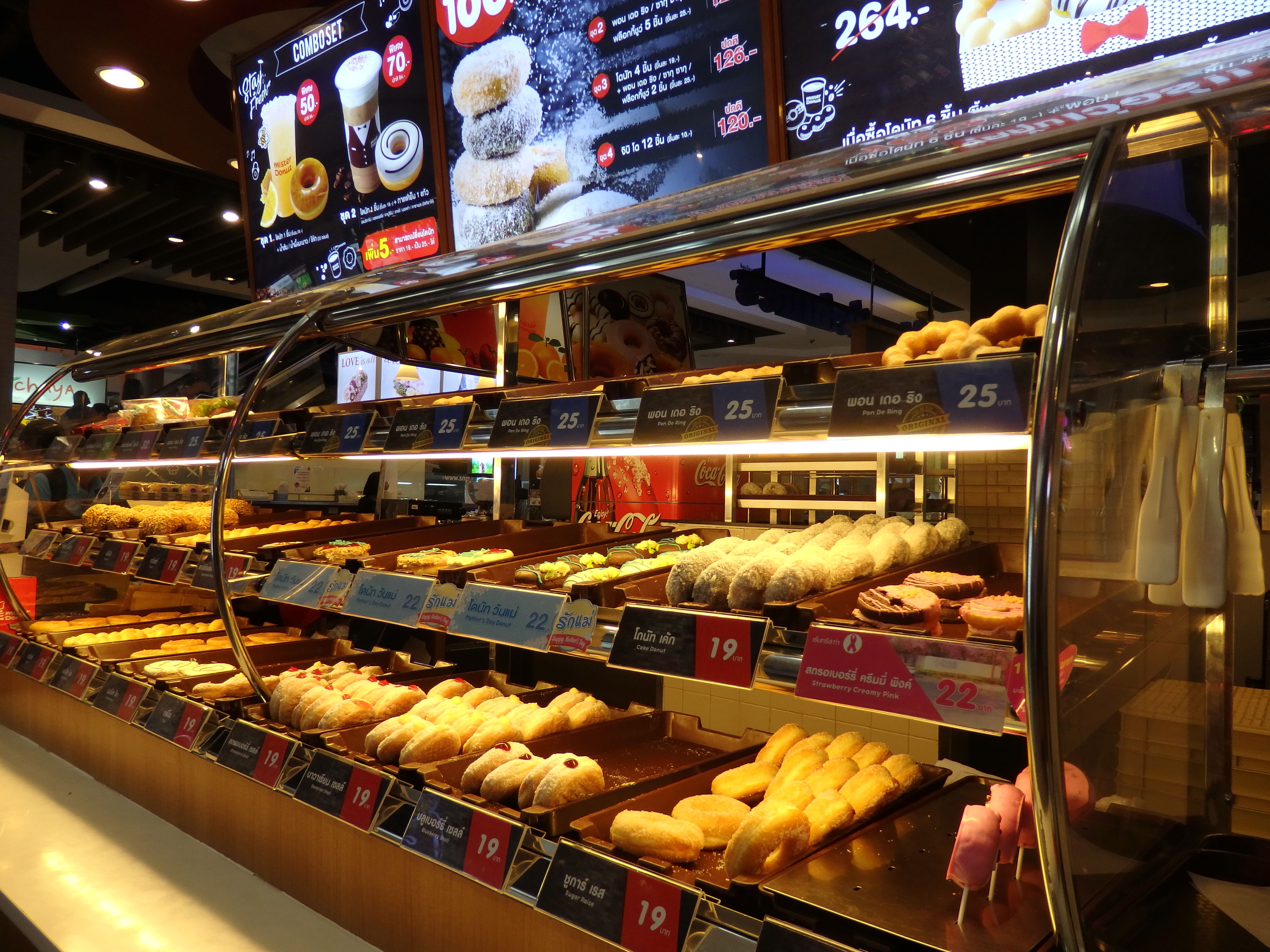 サパーンタクシン駅そばのロビンソンデパートの地下の様子を少し。これがバンコクのミスタードーナツ ね。やっぱ安い。そして日本にはない種類が。みんなランブータン (ンゴ)に集ってた。食べてみたかったけど、食後だったので買うのやめた。買えばよかった。
