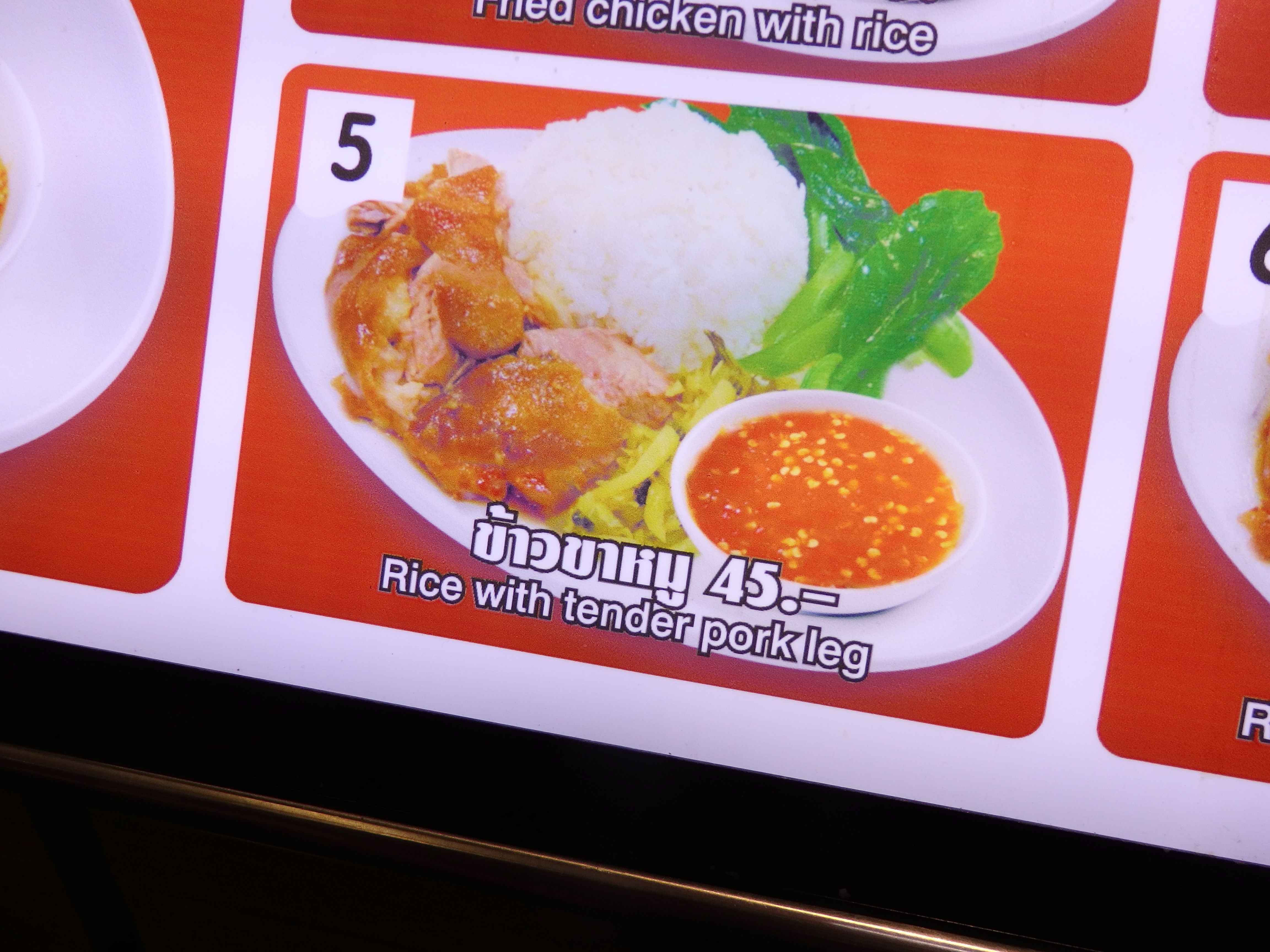 ホテル センターポイントシーロムにロビンソンデパートが。ロビンソンのフードコートにて食事を。上の写真の5番のrice with tender pork leg 45タイバーツ。美味しそうだなと思って注文して出てきたのが下の写真。あれ?写真と違う。でもおいしかったよ。支払いは、フードコート前でプリペイドカードを購入してそのカードをそれぞれのお店の人に渡して支払う。フードコート横は小さなゲームセンターになっていた。ロビンソンの地下のスーパーでいろいろ買えたのがよかった。メントス キャラメルチョコが大好きでよく日本でも購入するんだけどロビンソンの地下のスーパーでは日本の1/3くらいの値段だった。こりゃ安い。ロビンソンにはマクドナルドもスターバックスもケンタッキーもある。マクドナルドではお粥があったりと、日本とはメニューが違って楽しい。私はどこの国に行っても、マクドは必ずといってもいいほどいく。メニューが違ったりして楽しくて。