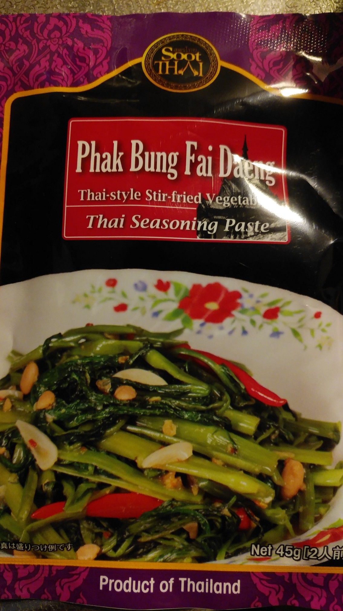 で。前回の日記の続きなのだけれど 東桜パクチーの青菜炒めに魅せられ、 我が家でも作れないかと、探したら カルディでシーズニングペーストが売られてた。 Soot Thai スータイ 空心菜シーズニングペースト (バックブーン・ファイデーン タイ風野菜炒め) 45g で、空心菜が手に入らないので、代わりに小松菜で作ってみた。 もやしも入れてみた。 それぞれ二袋づつ。 ↓できあがり 美味しいけど、やはり東桜パクチーの野菜炒めには及ばず。