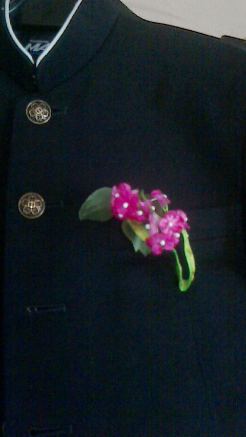 ヨシの卒業式。自分で作った市の花「ユキワリコザクラ」を胸に、ニヤニヤ、ヘラヘラして卒業しました。。。
