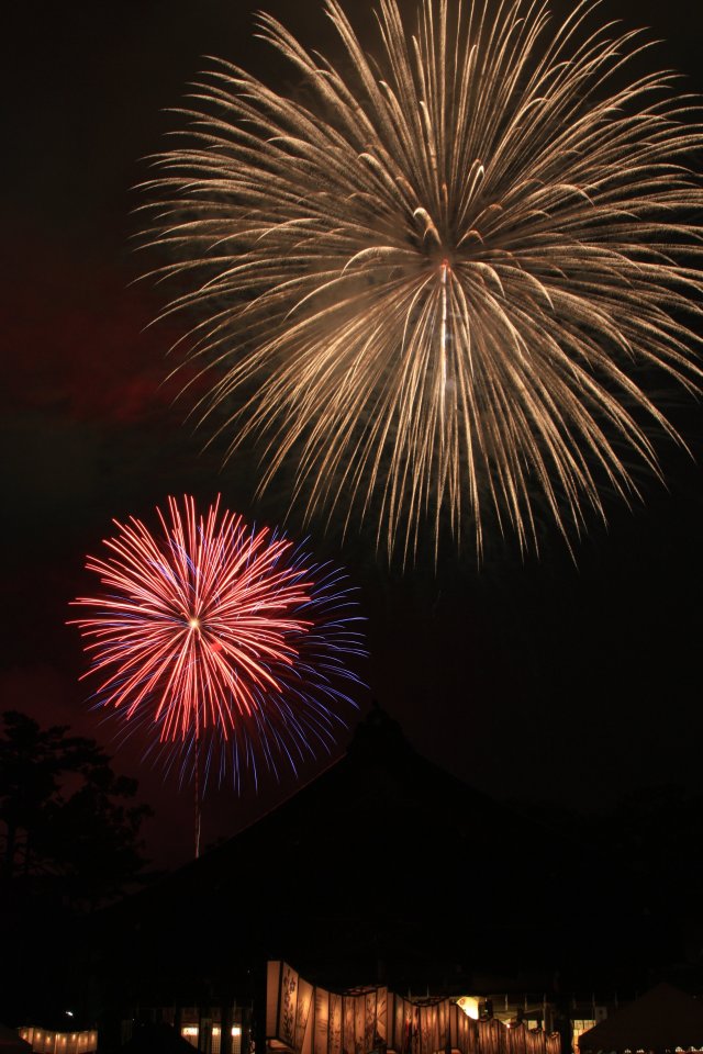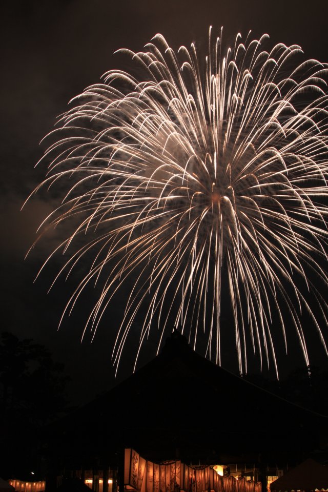 花火を撮ってみた。DataCanon EOS Kiss x2EF 24-105mm F4L(24mm相当)絞り:F11,露光:5秒,ISO100(固定),MFモード(無限遠)2コマ比較明コンポジット