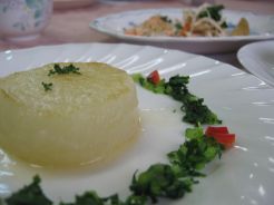 今日は、幼稚園の母ともが、勤めている、茨木にあるエルベ料理教室に誘われて、初めて行ってみました。食育に、こだわっている料理教室で、玄米を使った料理などで、美味しくってヘルシーな料理を、沢山習って来ました(^∇^)メニューは、洋風玄米巻き寿司 大根バターステーキ 鮭の香草焼き チキンとほうれん草の和え物 の4品です。大根ステーキは、茹でてから、玄米粉をまぶして、パン粉でからめて、バターで、焼くと言うもの。その上に、ワイン&レモンのたれをかけて、すっごい美味しかったです★(←家では、面倒なので、絶対やらないと思いますけど)後は、いたって簡単料理。でも、圧力鍋を使った料理だったので、スピーディーで、びっくりでした。圧力鍋欲しくなったわ~★
