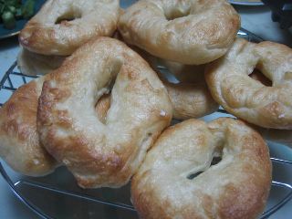 今日は、以前、タルトさんに、レシピを貰っていた、ベーグルに挑戦!ベーグルは、ちと、面倒。何故かと言うと、練って、一次発酵して、ベンチタイム、形成、二次発酵、お湯で、茹でる、水を拭きとって、オーブンで15分焼くと言う、工程があるのです。で、焼きあがってみたら、なんか、膨らみが足りない!早速、タルトさんに、電話で聞いてみたら、「スーパー強力粉」と言う物を使わないといけないらしい。知らんかったぁ~!ベーグルは、この粉じゃないと、膨らみが悪いらしい。次回は、この粉で挑戦しよう★でも、手作りベーグルは、最高美味しいよ!!びっくり!!、外側は、パリっとしてて、中は、もっちり!めちゃいけてる♪で、私ぱくぱくって六個も食べちゃった(><)はよ、白いんげん買ってこよう・・・