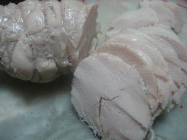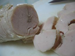 今日は、イギリスに住む友達が、「鶏ハム」に挑戦したと言うのが、ブログにのっていたので、早速、メールで作り方を聞いて、私も、挑戦してみました★作り方は、めちゃめちゃ簡単(^∀^)鶏むね肉を塩コショウ砂糖をふりかけて、袋に入れて、1~2日冷蔵庫で寝かす。塩抜きしてから、肉を凧糸で、ぐるぐる縛って、ラップで包み、更に、凧糸で縛る。で、お湯で30分程、茹でる。友達のは、ラップをしてないので、10分程、茹でたらいいみたい。私は、味が抜けると思って、ラップをしたので、沸騰させずに、90度くらいのお湯で、30分茹でました。で、昨日の晩に仕上がって、今日切って食べてみたのですが、これが、めちゃウマ!!!もう、バクバクいけますよ(笑)で、美味しいので、急きょ、パンに挟むことに!本当は、今日は、オレンジブレッドにしようと思っていたので、生地にオレンジジュースを入れこんでしまっていたのだ。全然、あわないけど、いいか!って事で、鶏ハムのオレンジブレッドなるものになってしまいました・・・でも、美味しかったです★
