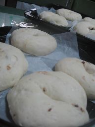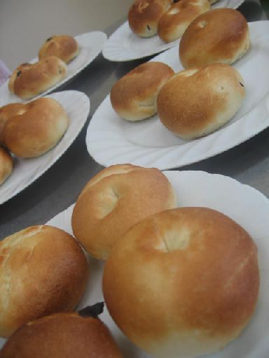 今日の料理サークルのメニューは、1チョコベーグル2.レーズンベーグル3.プレーンベーグルのベーグル3種をしました★ずっと、ベーグルを練習していたけど、いまいち、納得したものが出来ていなかっただけに、ちょっと、不安まじりに行いましたが、昨日、タルトさんからの電話でのアドバイスもあり、ミゴト大成功★今までで、一番上手く出来ました★確かに、茹でる時に、両面茹でるのでなく、片面のみ茹でるのが良い事。さっと、茹でる事、あと、形成の時、しわを作らないように、する事,水を入れすぎない事を気をつければ、なんとか、上手く出来ましたぁ~。でも、ベーグルは、奥が深いなぁ~。普通のパンがいかに、簡単か、よくわかったわ。それと、ちょこベーグルは、あんまし、上手く形成できませんでした。中で、チョコが溶けてしまうからみたい・・・ レシピは、トップページに後ほどアップしますねぇ~!