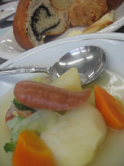 今日は、料理教室で、パンの講師をさせてもらいました。なんせ、ド素人なので、変に、詳しい人から、つっこみ入ると、絶対回答できないので、ちょっと、ドキドキでも、今日のメンバーは、パン教室に行った事のない人ばかりだったので、助かりました★朝から、パンを焼いたのを含め、何台、パン焼いたんだろう・・・すごい数だね!でも、とっても、満足してもらえて、「ほっ」でしたぁ=今日のメニューは、1,フランクフルトのポトフ 2,ふわふわ鶏ハムパン 3.ポテカツ 4.黒胡麻リングパン5.簡単ナン 6.食パン7.ドーナツ すごいのは、食パンの生地から3つのパンが出来た事★これは、料理の先生が作ってくれたんだけど、食パンの生地を3つに分けて、食パン、ナン、ドーナツを作ってくれました★あと、面白かったのが、ポテカツ、じゃがを、適当に切って、塩コショウで味付けして、小麦粉をまぶし、水にくぐらせてパン粉をつけて揚げるってやつ。普通、水じゃなくって、たまごでやるけど、水でも、十分に美味しい★ある意味、水の方が、美味しい!是非お試し下さいね★私の、ふわふわパンの、鶏ハムは、かなり質問責めでしたぁ~。作っていってよかったぁ~(^∀^)パンって、ほんと、ちょっとしたアイディアで、色んなパンに変身するので、楽しいね♪