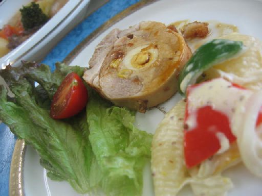 今日は、料理教室で、『クリスマスのパーティー料理』を習いました。すごく簡単で、美味しそうなモノばかりなので、クリスマスには、是非作りたいな♪今日のメニューは、 1.チキンロール&シェルマカロニサラダ今日の一番のおすすめ!チキンロール。鶏ももを広げて、鶏挽肉、ミックスベジタブル、うずら卵を中に入れて、タコ糸で巻いて、焼くだけ!!彩りも綺麗だし、クリスマスには、ピッタリ♪ 2.ビーフトマトチュー 3.ピンクのクリスマスリング18cmリング型を使用。いつもは、卵2つだけど、今日のは、卵白2 卵黄3個使って、小麦粉50gコーンスターチ10gと小麦粉の量を押さえて、ふわふわ感を出しています。しかし、この生地は、へたりやすいので、初心者の方には、不向きですね。このピンク色は、 グレナデンシロップと言うのを使っています。ざくろの絞った汁だそうです。すごい淡いピンクでかわいいケーキですよね!!!昨日、パパが、『1万円生活』を見ていて、よゐこの濱口さんが、めっちゃ美味しそうなパンを焼いていて、 『めちゃ、うまそう!!!食べたぁ~い!!!』を連発!!!くり子は、隣の部屋で、『うたばん』見てたんだけど、あまりに、耳障りな言葉に、つい『私、濱口まさるには、絶対負けてへんで!!こんなんより、もっと美味しいパン毎日焼いてるのにぃ~(泣)』って、言いに行ったわ。 ほんと、テレビって美味しそうに映るからさぁ~。(←負け惜しみ)得だよね★確かに、ぷっくりふわふわに焼けていて、ちょっと、悔しい・・・まっテレビだから、バックに、フードコーディネーターとかついてるもんね。しゃ~ないか・・・(ーー#) にしても、私、絶対、濱口まさるには、負けてへんと思うねん!!!誰か、旦那に言ってやって!!!!で、あんな、シンプルなパンでいいのかと、あえて、今日は、 シンプルis the best♪なパンを焼きました。これで、どうだ!!!