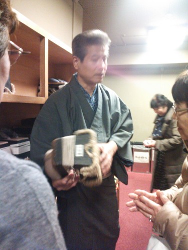 昨年、と言ってもついこの間ですけど、初めて文楽鑑賞の機会を得て、国立劇場(小劇場)に行ってきました。ブロ友のnaominさんのお世話で、一日目は高校生に混じって文楽鑑賞教室に参加、一日置いて二日目に本公演を見させていただきました。文楽鑑賞教室は、先ず舞「二人三番叟」、その後若手の人形遣いさんたちによる解説「文楽の魅力」、それから「絵本大功記」の「尼崎の役」でした。本公演は、「伽羅先代萩(めいぼくせんだいはぎ)」の「竹の間の段」と「御殿の段」、そして、「紙子仕立両面鑑(かみこじたてりょうめんかがみ)」の「大文字屋の段」でした。わたしは知識もなくて、説明はできませんが、文楽って伝統芸能とか日本の文化とかって怖いような前置きが付いてるし、綺麗だろうけど、初めてみるわたしなんか緊張して肩凝っちゃう、どころか、居眠りしちゃわないかと心配していたのですよ。でも、でも、全然違うのでした。理解出来るか不安だった台詞や歌(義太夫)も、舞台の両脇に字幕が出て、現代語訳ではないけどすごくよくわかり、今回、イヤホンガイドもお借りしなかったのに、ちゃんと楽しめました。少しだけ写真を撮りましたので、アップしておきます。まず、この方。人形遣い(主遣い)の吉田玉女(よしだたまめ)さんです。文楽の人形は、頭と右手を操る主遣いと、足遣いと左遣いの3人で操るそうです。こちらは、人形遣いさんが舞台で履く下駄です。楽屋には下駄箱に下駄が一杯。こちらは二人三番叟のお人形です。上の3体は、伽羅先代萩(めいぼくせんだいはぎ)の出演者。そしてここからは紙子仕立両面鑑(かみこじたてりょうめんかがみ)の人形です。上は悪役の狡い番頭で、権八という名前。大笑いさせてくれました。上にも書いたように、わたしはちゃんと説明できないので、きちん知りたい方はnaominさんが、ブログアップしてくださったのを、お読みください。文楽鑑賞教室はこちら、本公演はこちらです。わたしがあまりに面白かったというものですから、2月/3月の公演には、毎月一緒にお墓参りをしてご飯を食べる友人たちも行きたいと言い出し、一緒に行くことになりました。