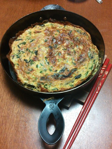 週末から読み逃げばかりでごめんなさい。忙しいというより、何だかイマイチ能率が悪いというか、手際が悪いというか、計画倒れな位何にも出来てないのに、気が付くと深夜という毎日です。膝だけでなく、頭も潤滑油が足りないかも。ところで、前に日記にアップしたお鍋2種類、今夜も大活躍です。陶板鍋でキャベツとウィンナソーセージでスープ煮を作っている間に、グリルダッチオーブンでこんな卵焼きを作ってみました。行き当たりばったりに入れた具は、白ネギと豆苗を小口から刻んだものと、ちょっと湿気てしまった焼き海苔をちぎったもの、それに納豆2パック。全部混ぜ合わせて、納豆のたれ2個を投入、お塩とおしょうゆ少々、粉末ダシも気は心ぐらい、お水を大さじに1杯、大きめ卵を4個。グリルダッチオーブンは、直径が20cm位。何のコーティングもしてない鉄製です。それを、コンロで2-3分予熱して、油を少し入れて馴染ませたら、卵液を全部入れちゃいます。その前に魚焼きグリルの余熱を開始。強火で約3分です。コンロの方は中火にして、グリルが温まるまで、卵を底からこそげるように大きくかき混ぜます。予熱が出来たら、グリルの火を一番弱くして、蓋をしたグリルダッチオーブンをグリルに入れます。3分半くらい置いて火を止めます。忙しかったのでその時の卵の状態はみていません。グリルの中にしばらく放置して、テーブルに出そうと明けた時は、取っ手が手で触れるくらいになっていたので、結構時間が経ったみたい。一切れ切り取ってみました。全然焦げ付いたりもしていません。もちろん食べてみました。う~~ん、マアマアかな?正直に言うと、もう少し工夫と練習が必要なレベルでした。1時間後です。あのあと息子が帰ってきて、この卵焼きを和風キッシュっていう感じだねと言っていました。