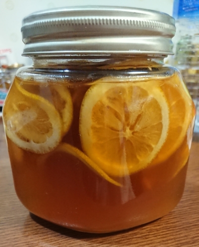 今日は仕事始め。朝起きた時、やはりなんだかボ~~っとしてました。この一年、思いやられますね。さて、レモンの蜂蜜漬けです。年末にnaominさんがレモンと柚子を蜂蜜漬けになさったと言う記事をアップしていらっしゃるのを見て、我が家の戸棚のなかで蜂蜜が結晶しちゃってたのを思い出しました。毎朝戴くヨーグルトのトッピング(夫用、わたしはトッピングなしでした)のためにまとめ買いしていたのですが、しばらく前に甘酒作りを始めてから、2人とも甘酒きな粉ヨーグルトにハマってしまい、蜂蜜はそれ以来デッドストック状態になっていたのです。ちょっと奮発の「幻の日本ミツバチの蜂蜜!」とやらで、とってもおいしい蜂蜜でしたので、使わないともったいないと思いつつ、実はほとんど忘れていたため、この寒さで結晶化させてしまったというお粗末でした。年末年始のお休みにはちみつレモンいいなあ。。。でも、輸入レモンは農薬が心配だからと、naominさん、皮を剥いていらして、それはめんどくさいなあ。。。で、結局その時はムニャムニャとなりましたが、年末にお正月用品を買いに行ったスーパーで珍しい国産レモンが2個パックで売っているのを見つけ、お~~~!!これだあ!!!と飛びつき、その結果がこうなりました。国産×国産と言うことで全部漢字の檸檬蜂蜜漬けと表記してみました。折角丸ごと使えるレモンが買えたので、はちみつレモンにしたとき全部食べてしまえるようにレモンをなるべく薄くスライスしたのですが、これ、大正解。お湯で薄めて戴くと、香りはいいし、最後にスライスレモンが少し酸っぱくほろ苦く丁度良い味わいです。「幻の日本ミツバチ」もいい仕事をしてくれたようで、コクはありつつもサッパリした甘さが絶妙です。二人ではなかなか減らないので、はちみつレモン以外にも何か使えないかなと思案中です。