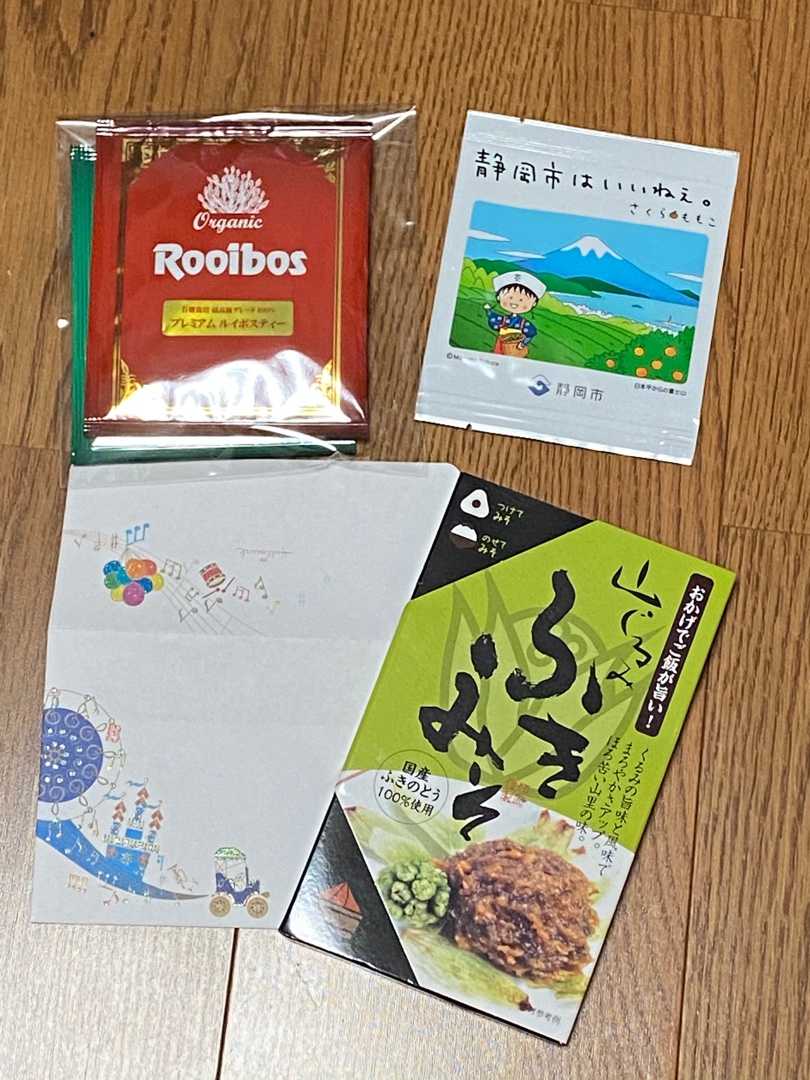 可愛い封筒(左下でお味噌の下敷きになってる)とお揃いの便箋に書かれたお手紙と近くにお出かけされた時に買われたというもの、いろいろ。