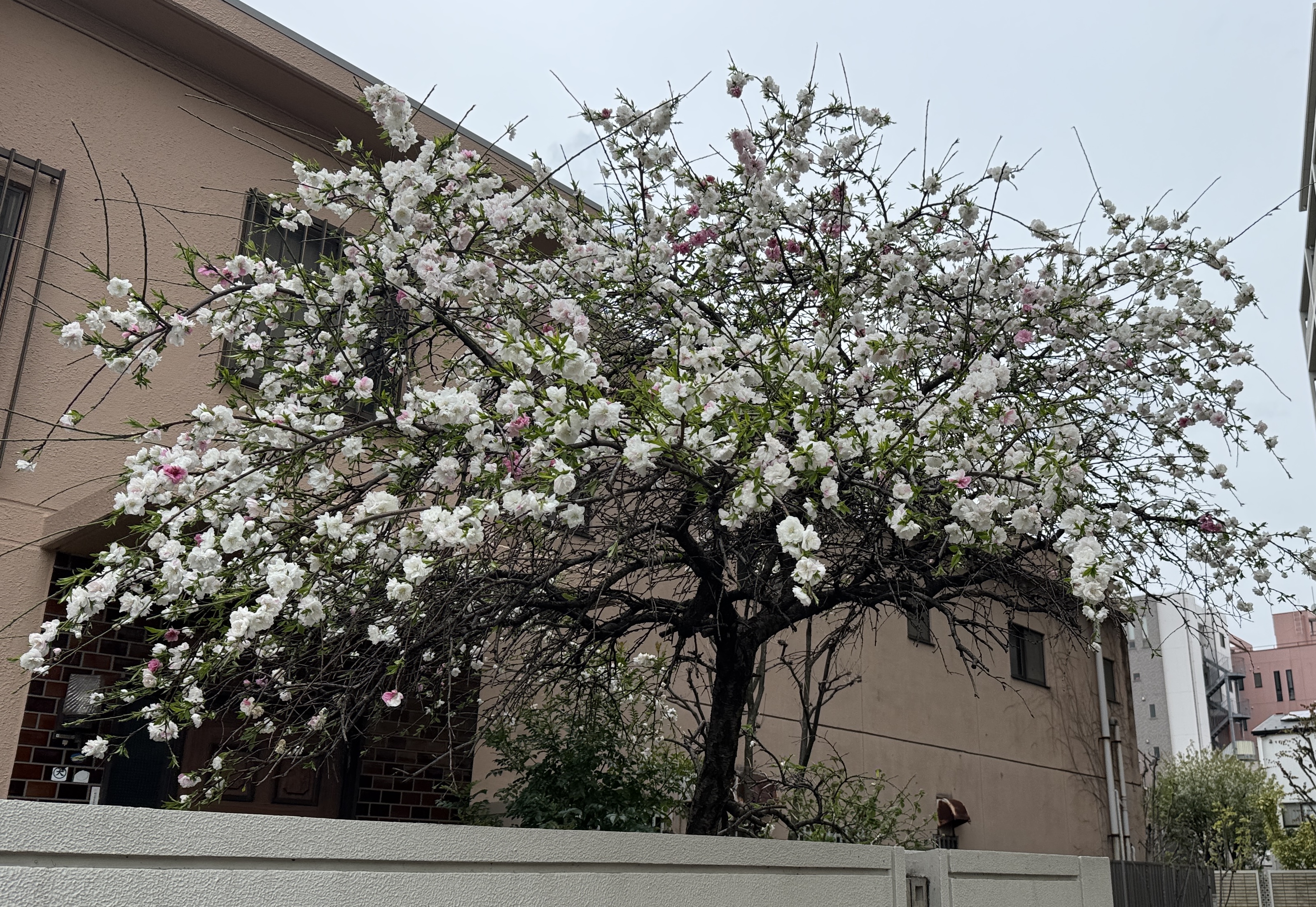 神社近くのお宅のお庭に咲いていた、多分ハナモモ?