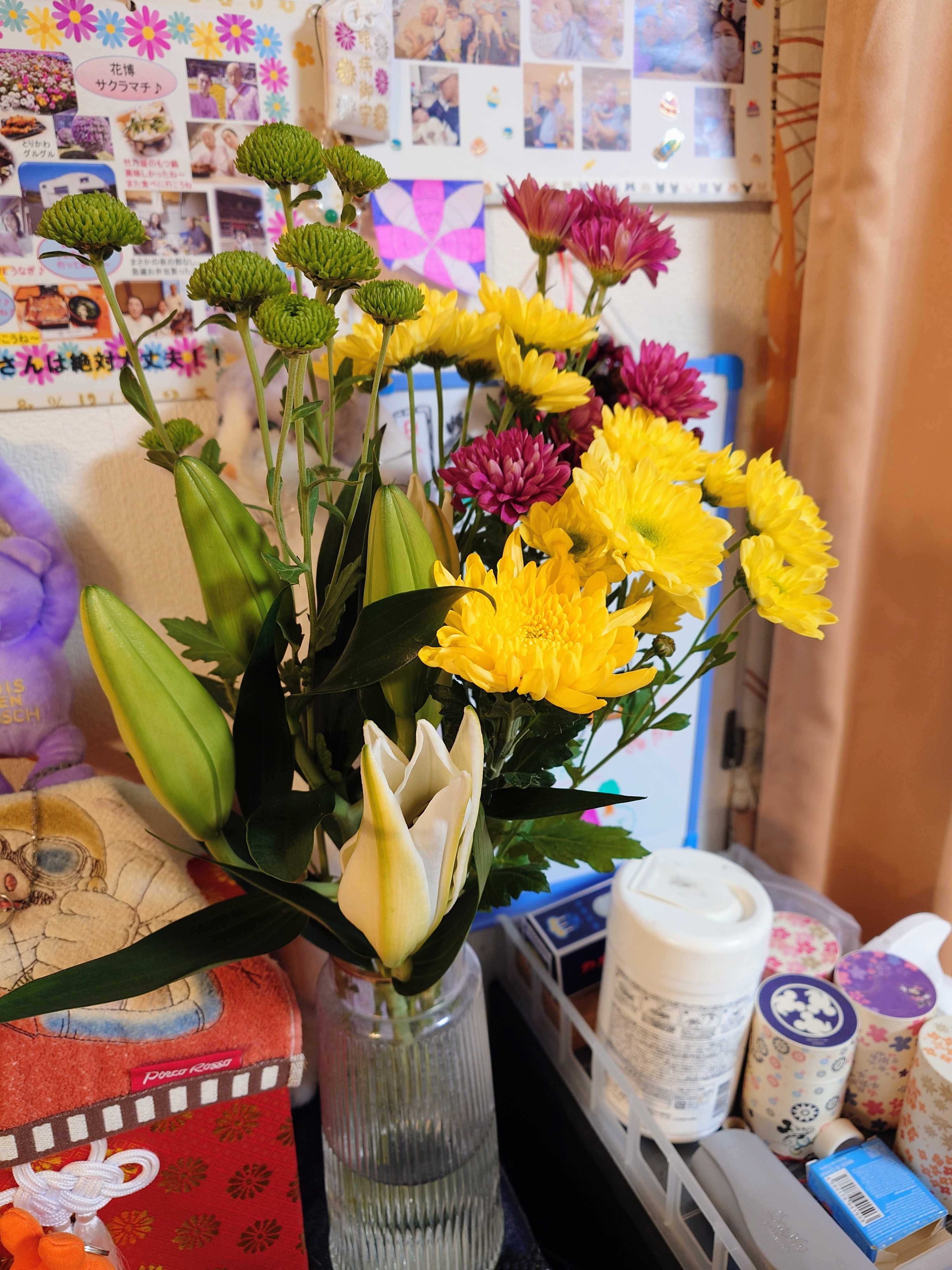 今日は旦那さんの月命日 母親がお花を持ってきてくれたよ😄 きれいだね😄 …