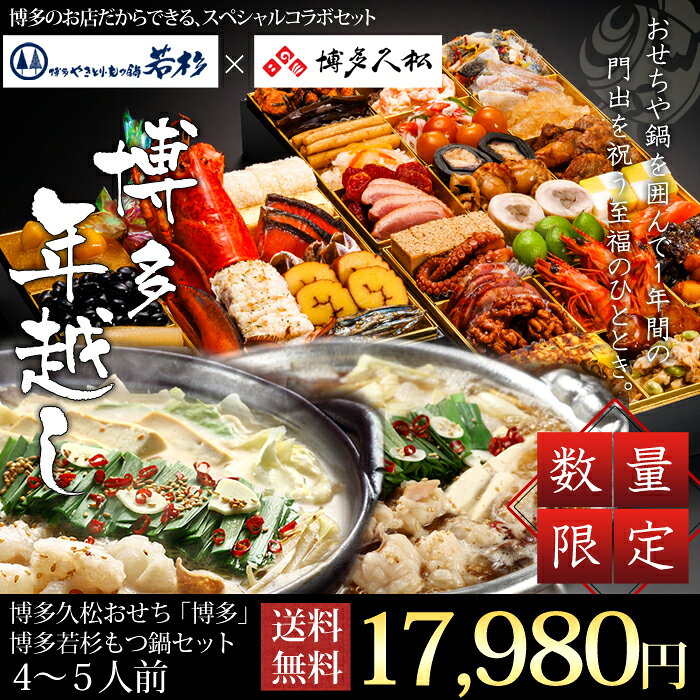 これスッゴイお得だけどわが家には多すぎる~(+o+)【送料無料】博多年越しセット【博多久松おせち「博多」全45品4-5人前】&【博多もつ鍋セット(醤油味)2-3人前×2セット】【RCP】