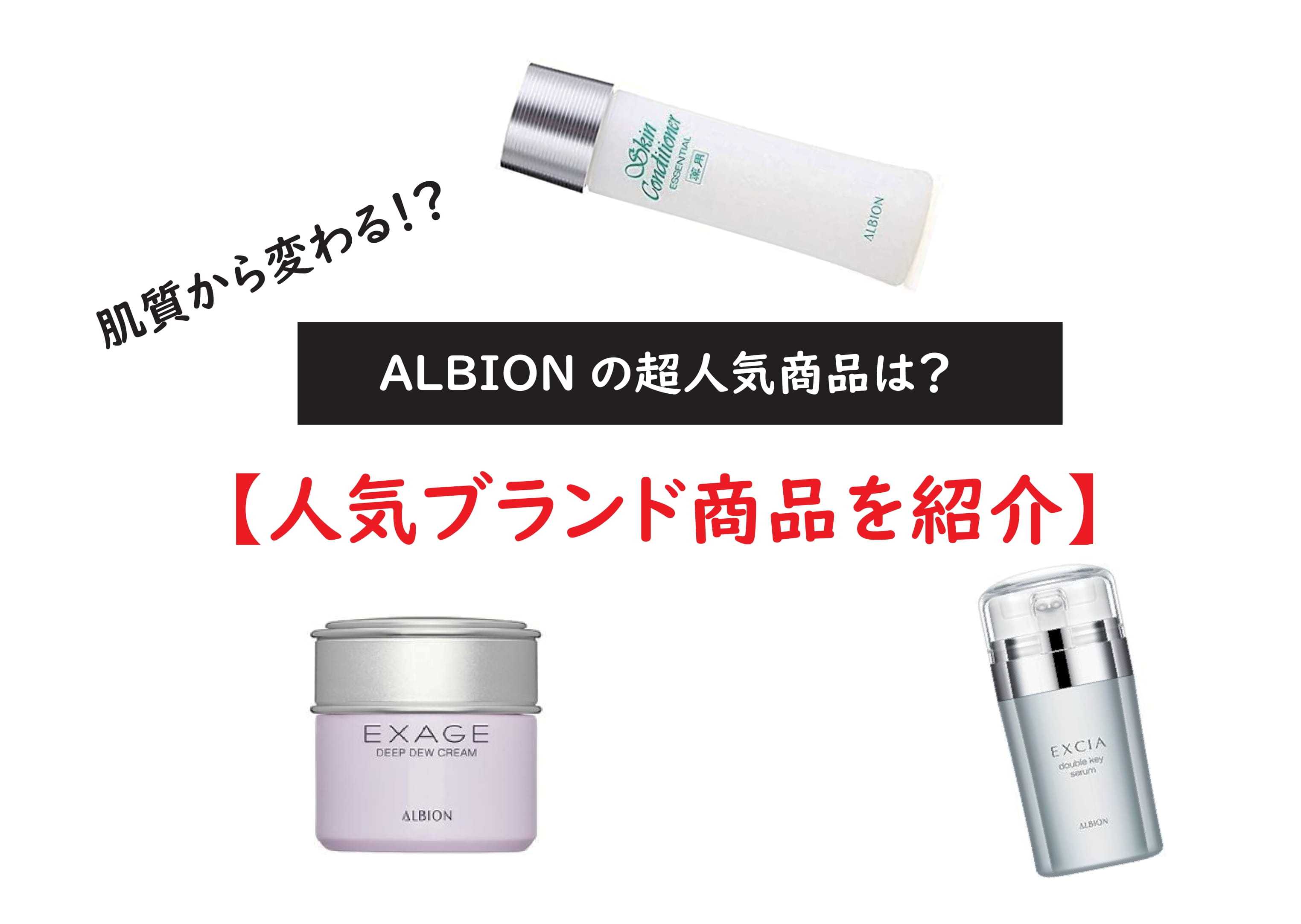 こんにちは赤です今回は人気の化粧品ブランド「ALBION」の商品などをご紹介していきます。「ALBION」アルビオン。一度は聞いたことがある方が多いと思います。実はアルビオンは50年以上の歴史を持つブランドです。肌本来の良さを引き出すことをコンセプトに商品開発を行っています。年齢層も広くこれからのお肌の調子を気にかけ始める20代の女性にも、現在のお肌の状態を気にかける50代の女性にも等しく愛用されています。通信販売よりも実店舗でカウンセリングつきの対面販売が強く、通販にはない商品もあるそうです。売り方にもこだわりがみられますね。そんなALBIONのスキンケア人気商品を3つご紹介していきます。薬用スキンコンディショナーエッセンシャル 110mL楽天最安値は、こちらから↓↓↓↓アルビオン ALBION 薬用スキンコンディショナーエッセンシャル 110mL ※お一人様1点限りエクサージュ ディープデュウ クリーム楽天最安値は、こちらから↓↓↓↓アルビオン ALBION エクサージュ ディープデュウクリーム 30g ※お一人様2点限り ○○エクシア ダブルキー セラム楽天最安値は、こちらから↓↓↓↓アルビオン エクシアダブルキーセラム 美容液 40ml3つの人気商品をご紹介しました。ALBIONはデパコスのクラスに入るお高めの金額が多いですね。金額も高額の商品が多いですが、それ以上のクオリティーが実感できるので、ぜひ試してみてくださいね。それではまた~フォロー、いいねいつもありがとうございます