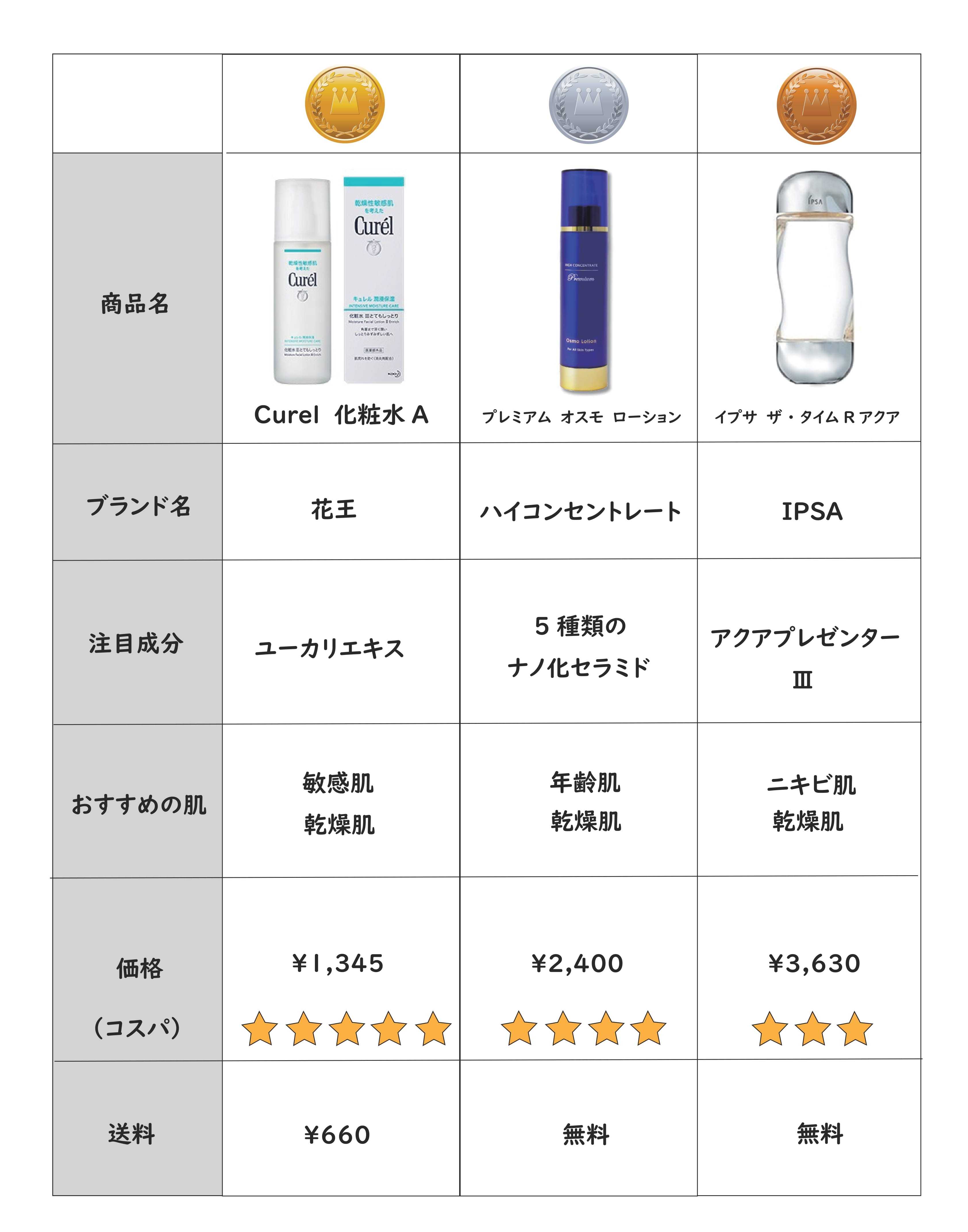 こんにちは赤です今回は、以前書いた【プチプラ編】の続きで化粧水について書いていこうと思います。化粧水って必要!?(化粧水不要論)なんて言われた時もありましたが、不必要なら誰も使わん。化粧水で水分補給をし、お肌のコンディションを整える役目をしてくれます。水でいい!!って思う方もいるかと思いますが流石に水だと直ぐ弾くのでダメですからね。それでは今注目のプチプラ化粧水をご紹介花王キュレル 化粧水 III とてもしっとり花王 キュレル 潤浸保湿 フェイスケア 化粧水3 とてもしっとり 150ML (医薬部外品)Amazon1980円なので楽天が安い!敏感肌、乾燥肌の方にはおすすめ。パッケージにも書いている通り、肌への刺激がなくやさしいスキンケア商品。ハイコンセントレートプレミアム オスモ ローション【450円クーポン&最大7倍 10/1限定】送料無料 ハイコンセントレート プレミアム オスモローション 150ml | 激安 HIGH CONCENTRATE 化粧水Amazonには、この商品はありませんでした。楽天最安値で、5種類のセラミドは魅力的ですよね。製造がUSAなので輸入品です。僕も試してみたい一品。イプサザ・タイムRアクアイプサ iPSA ザ・タイムRアクア 200mL【楽天最安値に挑戦中】Amazonでは4300円。楽天最安値はメーカーの販売価格4400円より安い3630円!!有効成分が肌荒れや大人の肌のニキビを防ぐのは悩んでいる方には強い味方。ちなみに3630円は楽天最安値。通常は4400円以上なのでお買い得。在庫切れとかもあるかと思うのでお早めに。デパコスとかだと5000円以上のものが多いですが1000円~3000円程度だとお手頃でいいですね。高すぎるとビビッてしまう。僕が・・・それではまた~。フォロー、いいね!いつもありがとうございます。