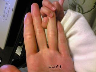 今日は、午前中近くの総合病院に娘の保湿剤をもらいに行って来ました。赤ちゃんの肌は乾燥するので、このローションをたっぷりと塗っています。皮膚科の待合室で待っているときにふと「整形外科」の看板が目にとまりました。1ヶ月以上前から左手の薬指の下に違和感があったのですが、整体で相談してもちっともよくならないし、最近は雑巾が絞れないほど痛くなってきていました。育児で手を使いすぎたからかしら?と思って整形外科で診てもらうことにしました。レントゲンを3枚も撮り、「ガングリオンですね、良性の軟部腫瘍で神経を圧迫しているから痛みがでるんです。注射器で抜きますね。」と看護婦さんに娘を預けて簡単に消毒した後、太い注射器をブスっと入れられました。ビックリするくらい痛くて驚きました。ゼリー状のものが中からでてきました。出血したためちょっとまだ紫になっていますが、すっかり傷みも取れたので完治したようです。 ちょうど文字の真上のあたりですネットで調べたら若い女性に多い病気とありました。若いの??