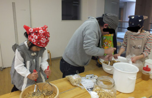 午前中娘のスイミングの後、私の愛する名古屋生活クラブが主催する「手造り味噌つくり交流会」に参加しました。(株)名古屋生活クラブはこだわりの食材を届けてくれる宅配サービスです。生協のグループとは違いますので、ご注意くださいね。独自にすべての食材の放射能の検査をしているので、安心して利用できます。いろいろな勉強会や講習会など開催されているのですが、私は初参加です。なんだか面白そうなので、お隣さん母娘を誘って参加しました。材料は事前に名古屋生活クラブで購入でき、大豆(1キロ)、米麹(1.5キロ)、塩(600グラム)だけです。大豆は煮て持って行くのですが、圧力鍋といえども1キロを煮るのは結構大変でした。説明書には圧力鍋で20分~40分煮てください・・・と書いてあり、私のアサヒ軽金属工業の加圧鍋で何分煮たらいいかな?と迷いましたが鍋の説明書通り1分の加圧で試したところ大丈夫でした。ただ、1回目は豆を入れすぎて蒸気が天井まで上がりすぎかなり焦りましたが・・・。お友達のKちゃんは、同じ加圧鍋で20分も加圧したため、1回目の大豆は焦がして持ってきました。あせって、主催者に電話したそうです 何とかその大豆も使用できましたが、アサヒ軽金属の加圧鍋はかなり強力だと判明しました。皆で大豆をつぶしています大豆つぶし機講師は福井から来てくださった、越前有機蔵マルカワみそさんです。米麹や大豆も作って一般の方にも販売しています。社長のいろいろなお話を伺うことができ、とても楽しかったです。大豆をうまく煮るのが味噌造りの一番のポイントだそうです。私達のアサヒ軽金属の加圧鍋で煮た豆は、「いいですね、美味しく炊けていますよ」と褒められました。味噌造りは大豆をつぶすのが、結構大変でした。娘と一緒に二つのマッシャーでつぶしましたが、1キロは大量です。名古屋生活クラブのスタッフも手伝ってくれて、半分は手でつぶし、残りは用意してあったつぶし機を利用しました。途中から娘は飽きちゃって、お友達と遊んでいました。まあ仕方ないですね。ただ、一緒に作業というのはなかなか楽しめます。ちなみに息子は託児サービスを利用しました。米麹と塩を混ぜ、それにつぶした大豆を混ぜます。混ぜたものをお団子状にしてカメなども容器に入れて終了です。10か月後に出来上がるらしいですが、マンションでは暑すぎるため、保管場所に困っています。左がつぶした大豆 右が麹と塩を混ぜたもの(塩切り麹といいます)つぶした大豆と塩切り麹を混ぜたもの一緒に参加したお友達はとても楽しかった!と喜んでくれました。小学校3年生の名古屋市の教科書には「大豆のいろいろな変化」という内容が載っているそうです。彼女は小学校3年生の担任をしているので、もう少し前に体験できればもっとよかったわ、と言っていました。この企画は毎年やっているらしいので、小学生の子供と一緒に参加するのもいいかもしれません。