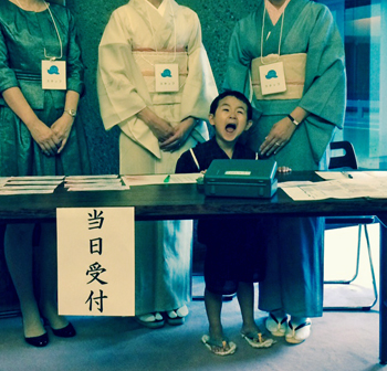 今日は第7回まいまい狂言会でした。朝、娘のクラスメイトを一人預かり皆で行ってきました。私は受付のお手伝いの為、オットが子ども達の面倒を見てくれました。第7回だから慣れたもの!?今年もKちゃんと受付です。あと一人のメンバーは今年は同級生のHちゃん。1年ぶりにメールで「着物で受付手伝って!」とずうずうしい私に「了解!」とすぐ返事をくれました。最近着付け教室をはじめたそうです。さすがの着こなしです。私は出発まであと10分というところで、顔が引きつりながらなんとか着付け完了しました。そばに居たオットが「今はママに決して話しかけないように...」と子ども達に注意していました娘(左端)の受付風景すぐ(5分くらい)いやになってしまって、「もう、やめる!」おいおい・・・・大丈夫か、娘・・・とちょっと心配になりました。今年はほぼ満席で、当日券もギリギリでした。今年の演目は2つとも面白かったです。子ども達も大笑いして楽しんだようです。まいまい狂言会のファンのひとりとして、これからも応援していきます。来年は2015年7月18日(土)です。楽しみです!!追伸5時近くまでクラスメイトをウチで預かり、3人でかくれんぼしたり、シャボン玉をしたり大騒ぎしていた子ども達です。実は今日から私は断食1日目です。この3連休旅行の予定が変更になり、ファスティングを実行中。
