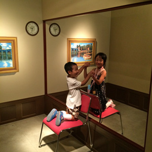 今日が最終日の名鉄百貨店で開催されているトリックアート展に子ども達と行ってきました。娘は9時からトワイライトスクールそして1時から短期スイミングを終えて3時過ぎに帰って来ました。今日はお昼に迎えにトワイライトスクールに行きましたが、10人が仲よくお弁当を食べていました。帰宅後、娘と一緒に息子を幼稚園に迎えに行き、名古屋駅に出発です!数年前に来たほどではないですが、待ち時間なしに入場できました。sちゃんチケットありがとうね!数年前に来た時より作品は面白かったです。息子も初体験で楽しんでいました。