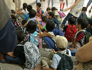 3週間の緑陰教室の最終日でした。今日は閉校式だけなので、雨の中息子とついて行きました。スタスタ地下鉄のホームに向かって地下街を歩いていく娘の背中を見て、「成長したなあ」としみじみ思いました。地下鉄も「次の電車は乗れないねー」など余裕の発言です地下鉄に反対に乗ったり、違う駅で降りたりいろいろありましたが、夏休みのいい経験になったようです。お友達になった女の子とは「じゃあまた来年ね」と約束したそうです。娘は「そうは言ったけど、その子の事覚えているかなあ」ですって!最終日は、参拝と閉校式で終了です。その後はスイミングのメンバーとホテルランチです。今年初のうなぎを食べました。子ども達は美味しい、美味しいとパクパク食べました。私は仕方なく子どもランチを食べました今はフェアー中でうなぎがお値打ちに食べられます!!(ウエスティンナゴヤキャッスル西の丸にて)お友達と一緒にお絵描き教室へ上の四つ切の作品は息子で、愛知県教育スポーツ振興財団の第7こども絵画コンクールの応募作品です幼児の部は「スポーツ」または「あそび」です。体操教室ではじめた鉄棒の絵を描きました。下の作品は娘で「いじめをなくそう」のポスターです。小学校の提出用です。「みんななかよく」というキャッチフレーズなんですが、ケンカしてプイッと横を向いています私が買い物している間にすごい色になってしまって、ビックリ!!下書きもかなり無視しているし先生曰く「ポスターとしては、ありだと思います」ですって!本当??