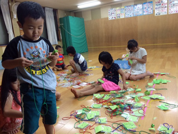 今日は娘と2人で市民体験講座に参加しました!ちなみに息子は幼稚園です!1か月以上前に「きっと夏休みは暇だから行くとこがなくていいかな?」申し込んでいましたが、意外に忙しくてというか私が予定を詰め込んだのですが、これは親子一緒に体験するものなので、楽しくでき良かったです。すべて野原で拾えるもので、リースを作りました。左では娘の作品、右は私です。娘は「ムクロジ」という木の実をふんだんに使いました。グルーガンで自由につけていくだけだから、とっても簡単です。最後に実が1個取れてしまって、娘が付け直していたらグルーガンでやけどをしてしまい、すっかり気分は落ち込んでしまいました。「もう、グルーガンはいっしょうつかわないから....」と女子らしい発言思わず笑ってしまいました!大したことはないのですが、寝るまでちょっと嫌なことがあると「手がいたい!」と訴えていましたよ!午後は短期スイミングとピアノのお稽古です。夕方一緒に息子を延長保育へ迎えに行きました。一部のPTA役員は搬入作業中でした。雨も降って来てしまって大変そう!今日は帰宅も早めだったので、ゆったりした夕方でした。