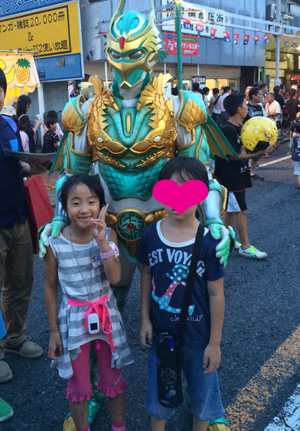 今日は緑陰教室に消防音楽隊がきたようです。娘は帰宅後、宿題の絵日記を書いていて、「もう!うまく書けない!」とイラついていた。女子って多々そういうことありますミッキーマウスマーチとゲラゲラポーとLet it go とあつたの歌を演奏してもらったようです。4曲とも覚えているなんて凄い!それになんてイマドキの子どもの心をつかむ選曲でしょう1時間以上かかって日記のみ完成。毎日娘の宿題にかなりの時間付き合っています。半分、ケンカです 終わったらケロっと娘の機嫌は良くなり、これまたびっくり!です。子ども達の習い事の後、某商店街の夏祭りに行ってきました。名古屋ローカルヒーローグランスピアーと一緒にパチリ幼稚園ママにこの水まんじゅうがおすすめと聞き、娘と食べました。その場で陶器の器から出してくれます。プルンと冷たく美味しい!です。わらびもちも美味しかったわ。実はお祭りの前に名古屋はゲリラ豪雨でした。私の実家あたりもたくさん降ったようで隣の家は床下浸水したそうです。雷が怖かった!
