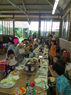 夏休みも最終週となりました!スイミングママ7人とその子ども達13名、総勢20名でホテル木曽路に1泊旅行してきました。娘と息子のお友達入り混じっての仲良しメンバーです。行きはあいにくのお天気でちょっと運転は怖かったですが、なんとか名古屋から90分でホテルに到着です。私が子ども達と楽しみたい事たくさん詰め込んだツアーになりました。11:00~はバーベキュー子ども達は食べてから、魚釣りチームと魚つかみチームに分かれて遊びました。魚つかみはMくんママが釣りの経験?を生かしプロの腕前、あと息子も5-6匹捕まえました。魚は怖くないらしい大量に取って炭火で焼いていただきました。焼きは実家でアユを焼いているMちゃんにお願いしました!その後は貸切室内プールです。1時間2000円で夏のみ利用できます。私はここははじめての利用でしたが、なかなか良かったです。さすがスイミングメンバー3歳でも4歳でも足が届かなくてもどんどん飛び込んで泳いでいました。怖がりの息子は、「ぼくはおぼれるから、足がつかないところではおよがない!」と理由をつけていました。温泉の後は夕食です。子ども達は一通り食べてから部屋で食後のアイスクリームと共にDVD「アナと雪の女王」鑑賞。ママ達はのんびり夕食を頂きました。贅沢な時間ですね!その後、カラオケボックスで妖怪ウォッチ体操などアニメソングで盛り上がり・・・・あと花火もしました!私は打ち上げ花火をたくさん持って行ったので、子ども達に喜んでもらえて嬉しかったです。0歳から小学校2年生の子ども達、かなり遅くまで盛り上がり皆で就寝です。大きな部屋で皆一緒だから余計にコーフンしちゃったかも。ママ達も夜更けのトークで大笑い!!アルコールなしでも大盛り上がりです。