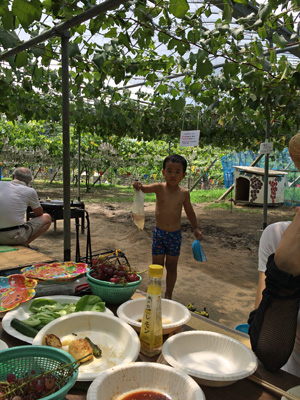 今日からオットは夏休みです。急遽オットも一緒に幼稚園ママ友3組で岡崎へブドウ狩りに行ってきました。このあたりはブドウ狩りができるところが沢山ありますが、今日はヤマサ園というところです。バーベキューもできるから、軽いノリで適当に持ち寄りにしない?と提案したのですが、超こだわりのママ友なので、素材、おつまみ、調味料などスペシャルなバーベキューとなりました。オットも美味しいものを食べるのが大好きなので、「こだわりがスゴイね!」と喜んでパクパク食べていました。息子が放流された鯉の稚魚を捕まえました!子ども向けにゲームや放流も2-3回ありましたよ!サービス満載です。ブドウ畑内に子どもの遊具もあり、目の届くところで遊べるのもポイントが高いと思います。園内の小川炭火でバーベキューの様子ビニールハウスの中にブドウ畑があり、その下なので直射日光も当たらず、でも風通しはよく快適でした。オットやお兄ちゃん達が3歳児たちと娘と一緒に遊んでくれたため、楽できました!のんびり、美味しいものを食べて素敵な1日になりました。結局皆、ブドウ(デラウエア)は一人1房も食べてないですね