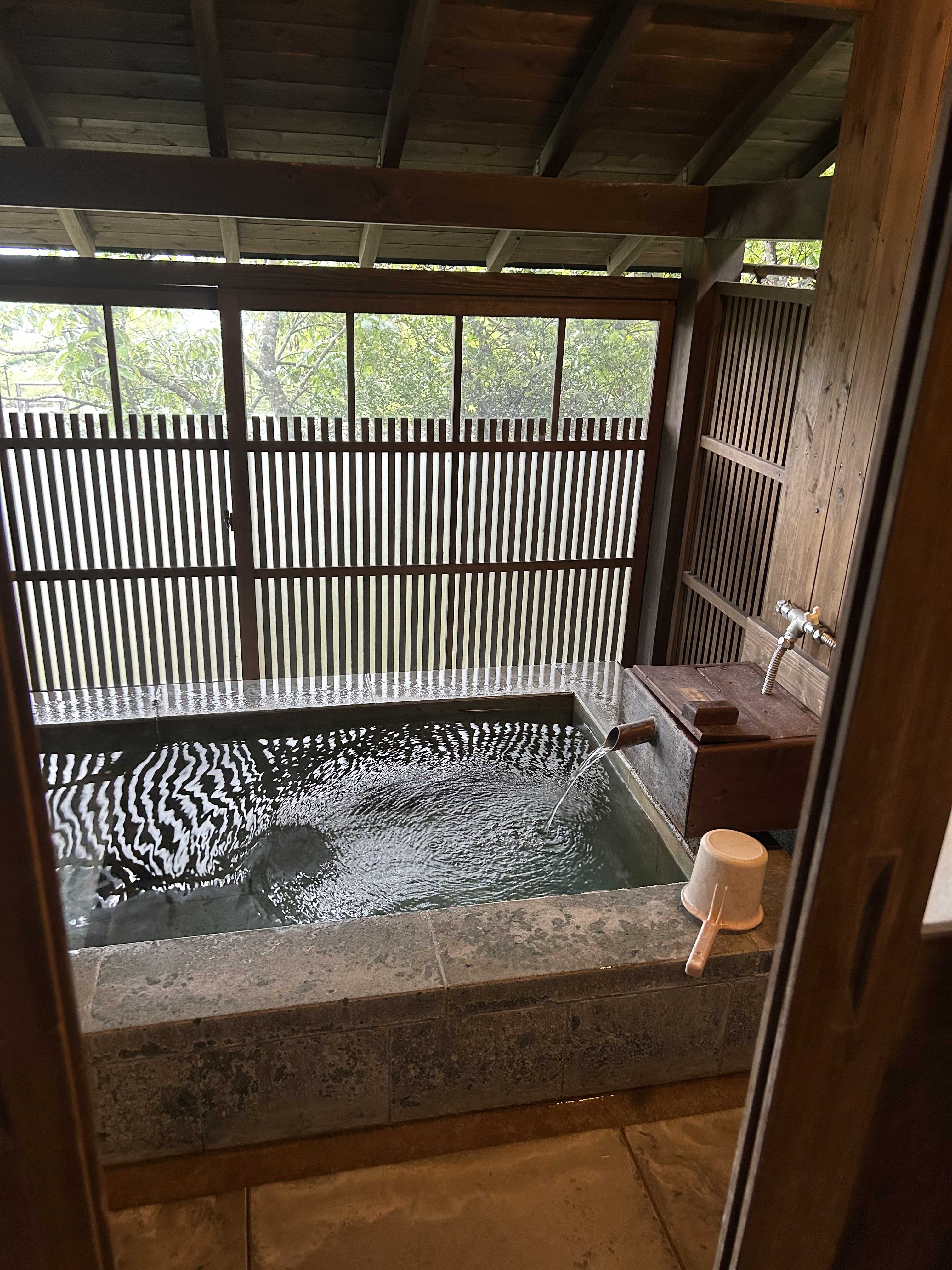 熊本県2日は、混浴朝風呂に出かけました。湯あみ着用ですが、貸切状態でした😊 お湯が良くて良い感じ。3人とも部屋風呂のお湯がいちばん良いんじゃないかしら、と意見が一致しました。たっぷりのお湯が出る掛け流しだから?湯けむりがあちこちに上がっていました旅館から近い、北里芝三郎記念館に行きました。新1000円札に採用されたからなのか、立派な建物で見応えありましたよ😊 ご本人も小国に帰った時に使用していた家の2階からの景色。お天気も良く素晴らしい😊お土産ものも、可愛くていろいろ購入しました。Aちゃんは生栗特大サイズを購入!道の駅や物産館より、ここの栗がいちばん立派なのが笑えます。その後は、鍋ケ滝へ。落差10メートル、横幅20メートルの滝です。裏側も見学できて面白かったわ。ランチは手打ち蕎麦です。天ぷら盛り合わせも美味しかったです。Sちゃんが久しぶりに従姉妹と会ったので、その間物産館でまたまたお買い物😊 スーツケースに入るの?あとから来たSちゃんは、1万円以上買ってましたけど😅16:00過ぎには山鹿温泉に到着。八千代座を見学しました。映画、国宝の世界。歌と踊りの発表中でしたが、名古屋から来た私たちに中を見学させてくれました。旅館の女将に栗スイーツのおすすめを聞いて、その場で予約。30分後の焼き上がりに間に合うように出かけました。右が焼きたてマロンパイ、左は栗だけ団子です。夕飯前に食べちゃったから、夕ご飯は苦しかった😅明日、栗だけ団子の販売整理券を求めて早く出発するために朝食の時間を早めてもらいました。明日は最終日です。おやすみなさい😊