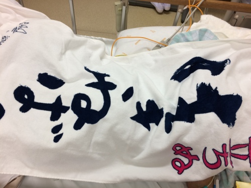 タロさんへのご心配ありがとうございます取りあえず最悪の状態は脱したようなのですが、誤嚥肺炎なので油断できません平熱が35度9分くらいなのですが、38度あります昨日は37度台になったので酸素吸入も外せたのですが、今日からまた1リットル入れてます81歳なので油断禁物ですよね本人は 2日目に「俺はもう治った。峠は越した。何度も入院しているからわかる」と言っていました。(^_^;) ですが、高齢の肺炎なので引き続き様子を見たいと思います泊りの付き添いはなくなりましたが、申し訳ありません当分読み逃げさせていただきます こんな笑える事も。たまたま家にあった新しいバスタオルをタロさんにかけていたのですが、メッセージみたいで看護師さんに大うけ。どこで買えるんですか?と聞かれましたジブリの「風立ちぬ」の上映時に新聞屋さんで頂いたものです^^ 危篤と言われ親族に来て頂き、セレモニーホールの書類も持って病院にいたのですがひとまず峠を越えた段階でちょっと病院のコンビニへ普段なかなか行けないミニストップが入っているので、通ってます^^;朝からソフトクリーム カール、買っちゃいました。ラスト3でそのうちの2つを我が親族で購入^^; 朝からハロハロも堪能してます 私的にはみたらし団子はもういいかな海苔の匂いが少し気になりました翌日は杏仁にしましたww連日ハロハロ と、私らしく食べて元気にやっております