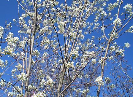 真っ青な空に、優しい細かな白い花が、点々と広がっています。ジューンベリーの花です。 六月には赤い実が、空に点々と浮かびます。 大木にならないし、丈夫だし、赤い実はジャムや果実酒になるし、紅葉は綺麗だし、といいこと尽くしで、人気があるのもうなづけます。 根元から、ひこばえ、というのでしょうか、何本かの枝が出てきますが、すっきり育てたい人は、それを切り取ってしまえばいいし、株立ちにしたい人は、それを五本くらい、残せばいいのです。私は、そのうちの一本を取り外して、別なところに植えてみたら、根付きました。それがこちらの木です。成長が早いので、三年ほどで、この大きさになりました。 大きくない庭に、同じ木が二本というのは、多いのですが、ジューンベリーは、背丈こそありますが、枝も葉も、細くしなやかなので大丈夫です。空からの白い花に包まれると、何はともあれ、幸せを感じます。 ブログランキングに参加しています応援のクリックをよろしくお願いします。
