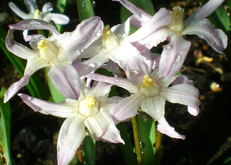 秋植えの小さな球根花、チオノドクサです。 薄~い紫色です。雪解けのころ咲くので、ユキゲユリ(雪解百合)などという可愛い日本名があります。 丈は15センチくらいで、毎年少しずつ増えていきます。球根は小さくて乾燥に弱いので、堀り上げずに植えっぱなしでいいんですよ。球根と宿根の多い、手間を省いた私の庭には、ぴったり。この可憐さが何とも言えず、お気にいりです。 別な場所に、ピンクのチオノドクサも芽を出していますが、まだピンクの花がチラッと見える程度です。場所が違うと、こんなに成長が違うの? とびっくりします。 ブログランキングに参加しています応援のクリックをよろしくお願いします。