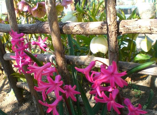 紫のヒヤシンスに少し遅れて、ピンクのヒヤシンスが開花しました。目が覚めるような綺麗なピンク、とっても美しい! ヒヤシンスの前にも、後ろにも、白やピンクのクリスマスローズが咲いているので、あまり目立たない、写真の撮りにくい場所にあります。来年は、場所を移してあげたいな、と思います。 膝のお皿の下あたりを骨折した友人が、お庭に来てくれました。まだギブスはしていますが、松葉杖がはずせたので、リハビリの散歩です。春になると、お互いの庭を毎日のように行き来してきたガーデニング仲間です。膝の部分が、大きく腫れていて、もう正座は出来ないし、庭仕事も、しゃがんですることは出来ないと思う、と言います。 アイアンのトレリスも、大きな鉢も、私にくれる、と言います。ちょっ、ちょっと待って。 どうしてそんなに早く結論を出すの。リハビリはこれからじゃない、と励ましました。 今回の震災で、彼女の家は、けっこう屋根の瓦が落ちて、青いビニールシートがかかっています。花を見ると、癒されはするけれど、屋根を見上げると、また気が重くなって・・、と。彼女もご主人を亡くされていて、一人暮らし。家の修繕など、お金のかかることも、自分で決断しなければならないし、屋根となると、否応なしですから、他人ごとでなく、よく分かります。 落ち込んで、落ち込んで、でも人は、じわりじわりと、立ち上がるのですよね。がんばろうね。 きっとまた花が楽しめる日が来るよ。 ブログランキングに参加しています応援のクリックをよろしくお願いします。