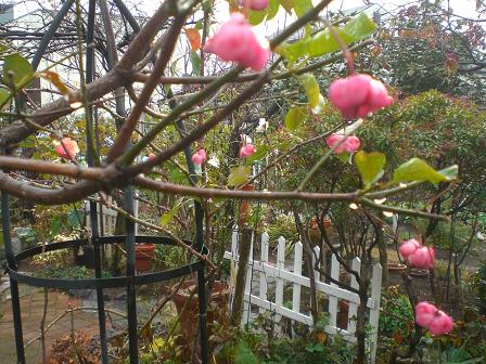 穏やかな冬の陽に、マユミの実のピンクがとても可愛いです。だいぶ落ちてしまいましたが、まだまだがんばっています。マユミは、日本や中国が原産と書いてあるし、名前からしてそんな感じですが、私は、ドイツのノイシュバンシュタイン城の崖に、咲いているのを見ましたよ。マユミさんが、こんなところにいる! とびっくりしたのを思い出します。 手作りのブランデーケーキが届きました。チョコレートケーキと、ヌガーケーキのようなものと、三種類が入っています。ブランデーケーキは、三ヶ月でも保存できるんですってね。それで、これはみんなが集まるお正月までおいておくことにしました。k さんが作ってくれたよ、と言えますものね。 お友達と食べてね、と言ってくれていたので、友人に声をかけ、チョコレートーキでお茶にしました。プロ顔負けの、絶賛のおいしさでした。私は、お菓子作りをしないので、こんなものを作れる人に、ただ感心してしまいます。そして、感謝です。 ブログランキングに参加しています応援のクリックをよろしくお願いします。