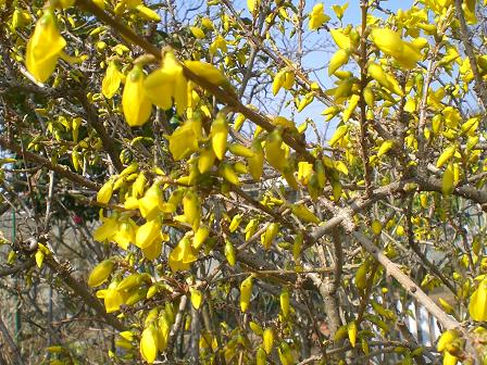 レンギョウ、黄色の筒状の四枚のはなびらで作られています。枝にびっしりと連なって咲く様子は、春そのものです。 何て青空に映えているのでしょうか。考えてみれば、花たちは、青空にこそ、ぴったりですね。 信者ではないけれど、聖書の、特に「創世記」が好きです。初めに神は天と地を創造された、で始まる創世記は、何度読んでもわくわく。光を生じさせて昼と夜を造り、大空を造り、乾いた陸地と、水の集まった海を造られた。 そしてここが一番好き。 「地は草を、種を結ぶ草木を、地の上に生えださせるように」した。花が咲き、散り、種が落ち、また再生して、やっぱり、これ神様しか出来ない、と思ってしまいます。 庭の中に、ちょっとした景色を作るのが楽しみ。ベルの向こうにレンギョウの景色、な~んて。 ウフフ、どうってことないか。 いまから、春休み中の孫たちのところへ、遊びに行ってきます。もう、高校生と中学生、行っても遊んではくれないんですがね。娘と、雑貨屋さんめぐりをするのが楽しみかな。三日ほど、ブログをお休みします。 ブログランキングに参加しています応援のクリックをよろしくお願いします。