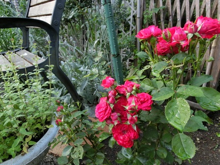 私のお気に入りの薔薇、ホットココアです。 黒みがかった赤い花びらも好きだし、丈夫で次々に咲いてくれるのも好き。ただ、トゲが太くて鋭いのが要注意です。 隣では、ベルガモットが開花を始めました。別名タイマツバナ。 松明が赤々とともり始めるのももうすぐです。ツボミのときから、タイマツになりそうな感じが出ていますね~根を伸ばして、それはそれは増えていきます。他の植物を凌駕するので、ここからこのあたりまでと、決めた場所以外に出てくるものは、さっぱりと抜くことにしていますよ。 昨日の午後は、山の方の施設へ傾聴ボランティアに行きましたが、途中の林の中に猿が遊んでいるのを見ました。鹿も住んでいるらしいです。先月は、すぐ近くのk市役所の敷地内に熊が出て、射殺されました。そのニュースにはびっくりしました。こんなところに現れるなんて。調べたら胃の中は空っぽだったとか。熊は勿論ですが、猿も鹿もこちらへ向かって来られれば怖いです。動物と人間、境界線をお互いが越えずに共存できたらいいのにね。 花ブログランキングに参加しています応援のクリックをよろしくお願いします。
