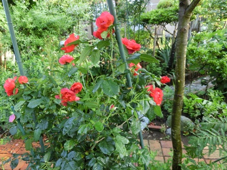 薔薇はスカーレットオベーションです。高さはせいぜい80cmくらいで、もう忘れるほど長くこの場所にいますが、毎年、なんで大きくならないんだろうと考えていました。最近になって、これはミニ薔薇だった、と分かりました~(笑)ミニ薔薇としては大きいほうなのですって。私の薔薇の知識は、そんな程度のものなのですよ。一枝にこんなに花が付いて、まるで花束のようです。いつもそばに置きたい本を一冊名前をあげなさい、と言われれば「赤毛のアン」。二位は?と言われれば「風と共に去りぬ」。ご存知のように主人公は、勝ち気で情熱的な女性スカーレット・オハラ。多分、スカーレットオベーションという名前に惹かれて植えたのではないかな、と思います。ちなみに、オベーションの意味は「喝采」です。足元には、スカーレット色(緋色)とはがらりと違う爽やかブルーのスカビオサ。もう二ヶ月くらい咲き続けていますが、まだまだツボミがいっぱいです。花期の長いのには驚きです。スカビオサは別名はマツムシソウですが、スカビオサは園芸品種。本来のマツムシソウは、もっと背が高く、いまでは数が減り絶滅危惧種だそうです。榛名山の高原で、爽やかに揺れていたマツムシソウは、今はどうなっているかしら。 花ブログランキングに参加しています応援のクリックをよろしくお願いします。