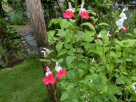 雨が止んでいる間に、ちょっと庭へ。少し触れただけでも、葉に溜まった雨粒が体を濡らします。花たちが、ぐったりと雨の重さに耐えかねて伏しているなかで、まっすぐ立っているのは、チェリーセージホットリップスです。濡れて色鮮やかな緑をバックに、花の色の美しいこと!年々大株に育っていくので、根元からバシバシと切っていますが、それでもすぐに大きくなり、この時期の植物の成長には負けてしまいます。一昨日、ゆすらごでジャムを作りましたが、その色が美しくて、毎朝食べるのが楽しみ。自家製のカスピ海ヨーグルトにゆすらごジャムを乗せていて、この色合わせ、チェリーセージとそっくりね、と思いました。ねっ。 花ブログランキングに参加しています応援のクリックをよろしくお願いします。