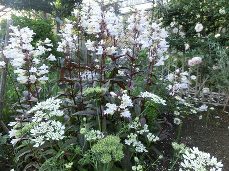 フランネル草。 葉っぱが布のフランネルのようにふわふわとした手触りです。茎も葉も銀色で、その伸びた茎のてっぺんに鮮やかなピンクの花が付きます。茎のさきに、一つだけの花が付くからかしら、私は「一人娘」という名前で教えられました。これで朝五時半の撮影です。もう陽がガンガン射してきています。明日はもっと早く起きようと思います。娘も、そのまた娘も、一人娘です。私は四人姉妹ですが、昨日もTちゃんと一時間以上も電話でしゃべったよ、と娘に報告したりすると、いいな、私も姉妹が欲しいな、と言ったりします。友達とはまた違う、生まれたときからのつながりがあるんですもの、まして姉妹となると、人には言えないことも喋れて、それは大切なものです。フランネル草が、別名一人娘だということから、ずいぶん脱線してしまいました。 この花、もう何年も何年も時期になると咲き続けていますが、名前が分かりません。白い花びらが、ランダムにあちこち向いて付いていて、甘~い香りがします。もしご存知の方がいたら、名前を教えて頂ければ嬉しいです。 早速にぐんまちゃんに教えて頂きました。ありがとうございました。 ハーブの一種で、シャボンソウまたは石鹸草というそうです。 名前のとおり、昔はヨーロッパでは、洗剤として利用されていたそうですよ。 名前が分かりすっきりしました。 花ブログランキングに参加しています応援のクリックをよろしくお願いします。